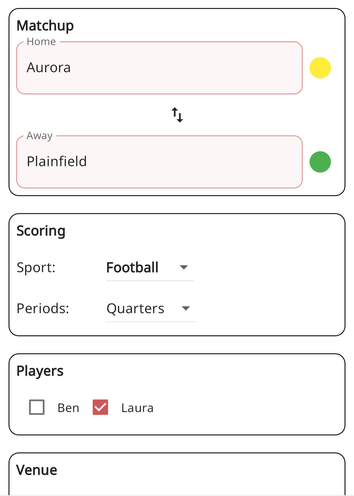 Optional game configuration lets you set sport, team colors, players and more.